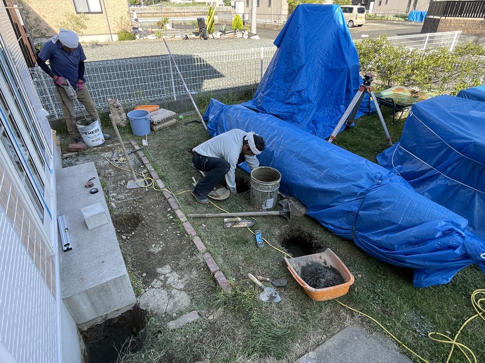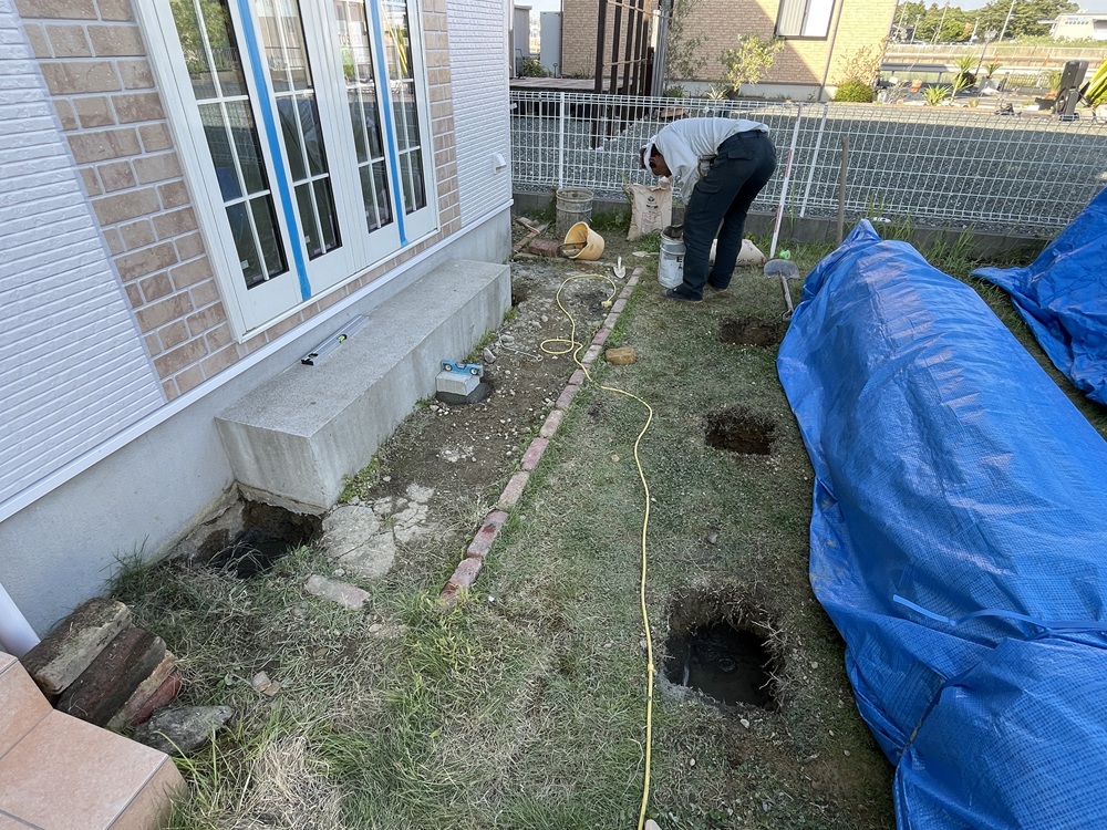 建物からの離れ寸法と柱を建つ位置を出してから、その部分をポイントで壺堀りしていきます。