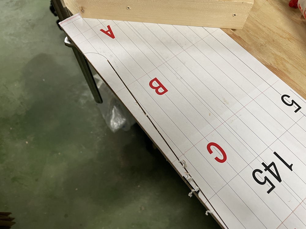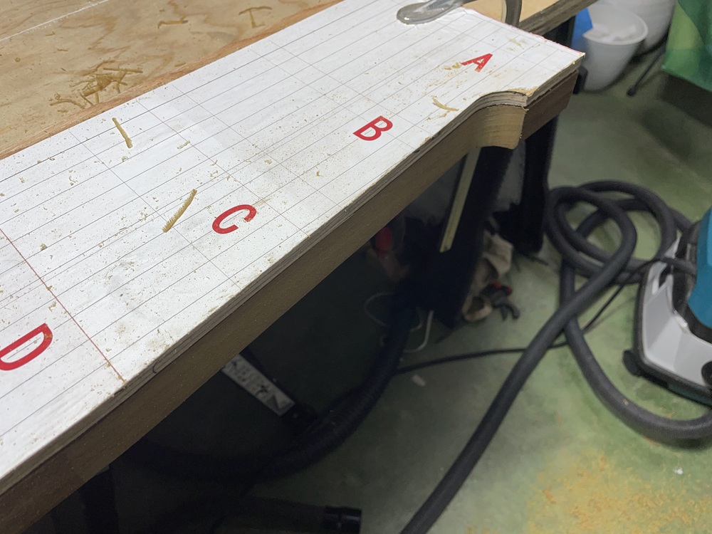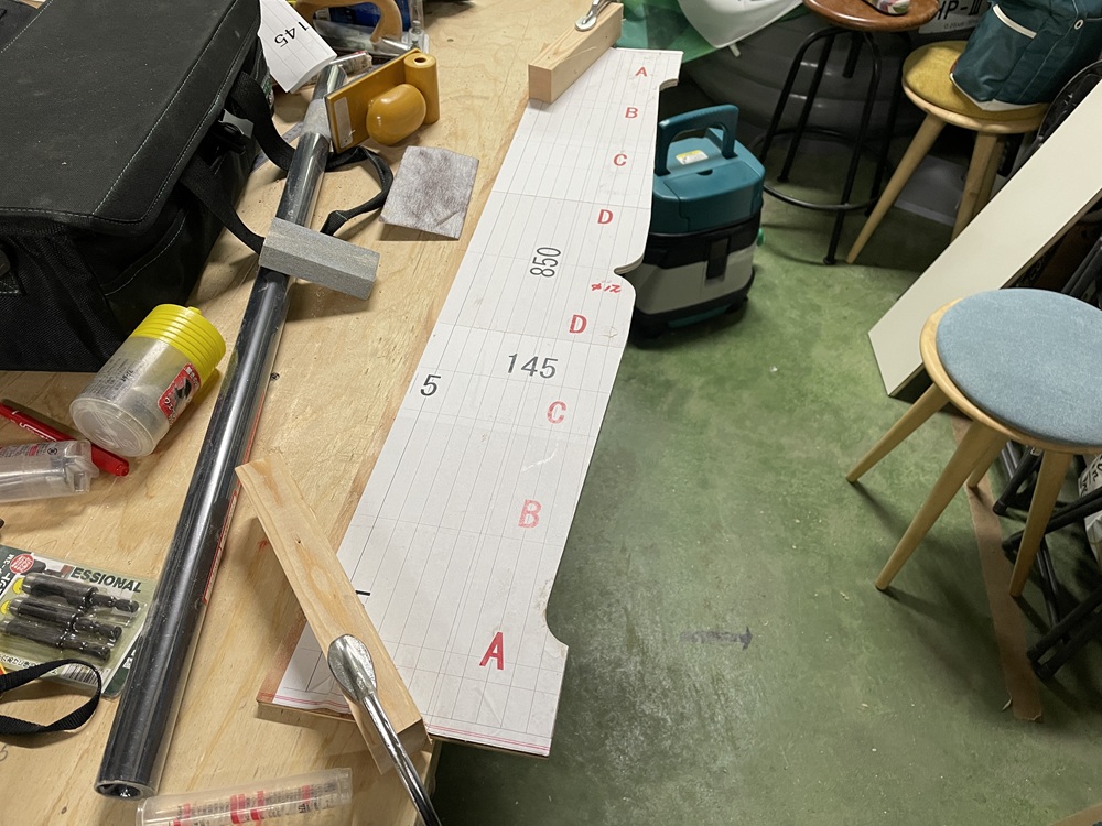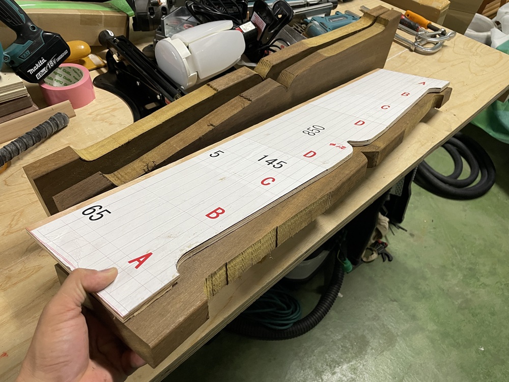CADで作成したイメージ図を原寸サイズでプリントアウト。それをを合板に貼り型板にするべく切り出し加工をしていきます。
