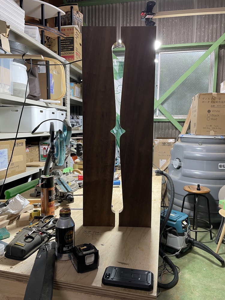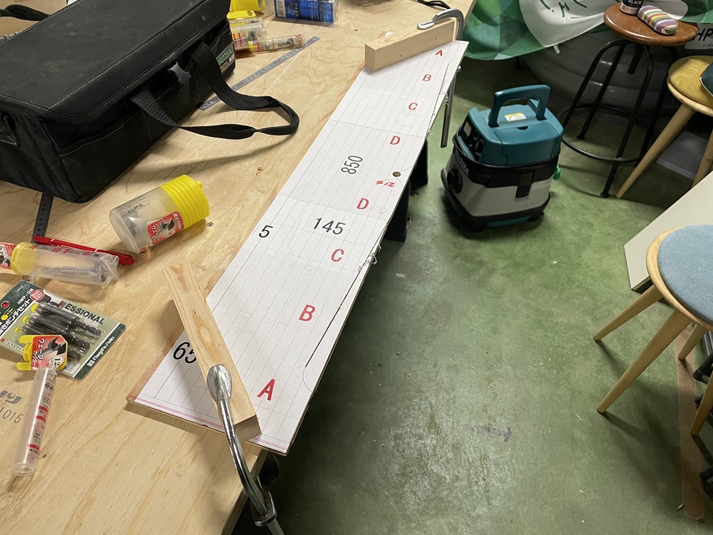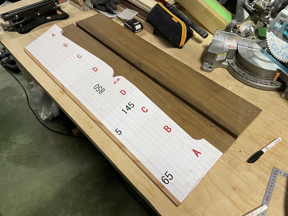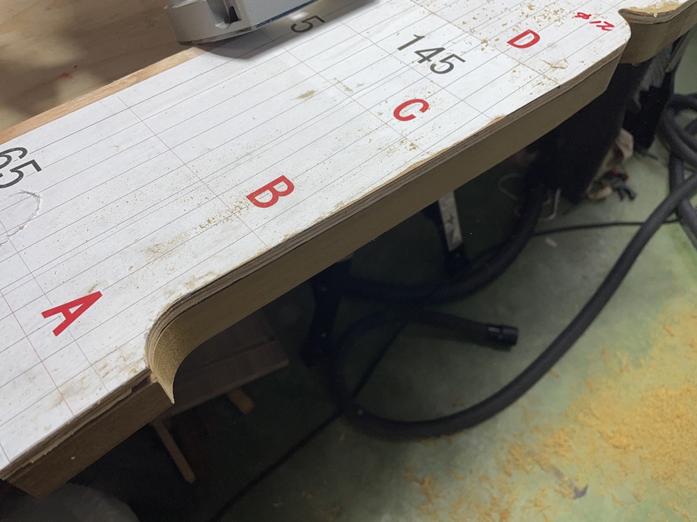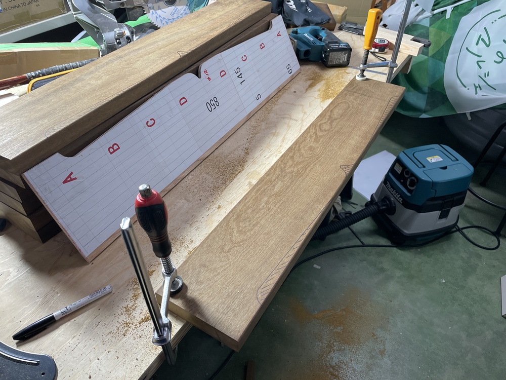 CADで作成したイメージ図を原寸サイズでプリントアウト。それをを合板に貼り型板にするべく切り出し加工をしていきます。