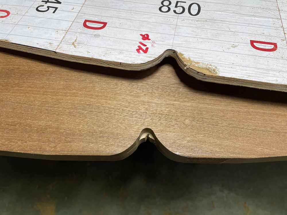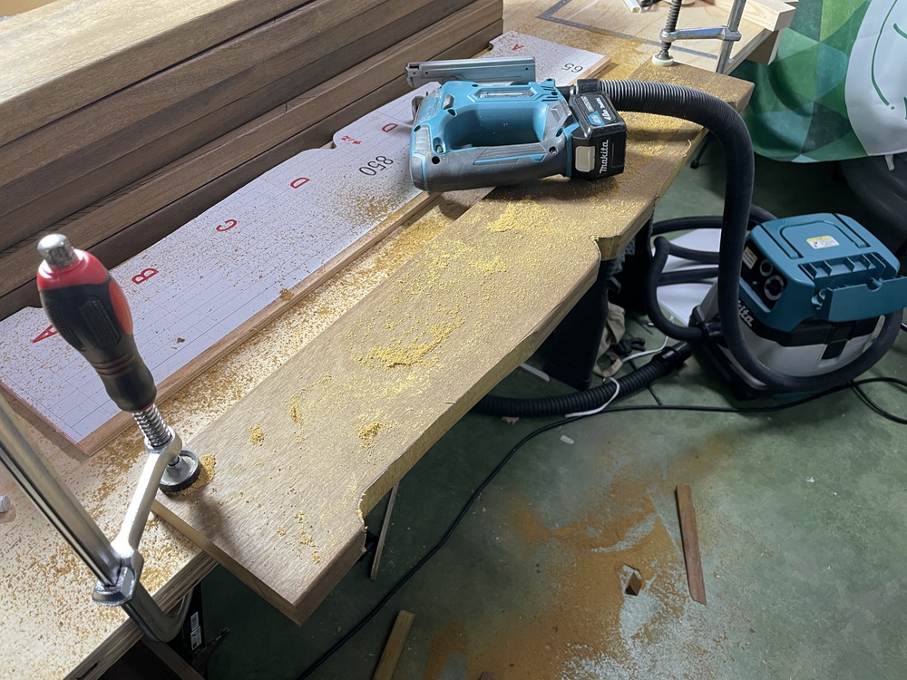 型板ができたら、次にその形を部材に写しジグソーと呼ばれる機械で荒切りをしていきます。