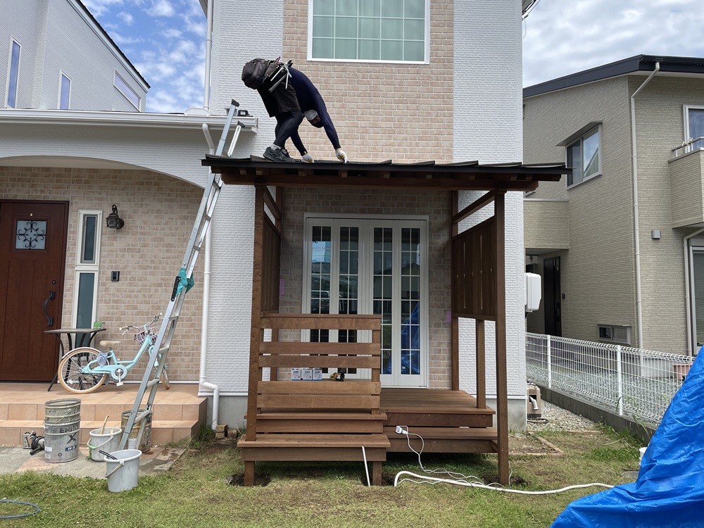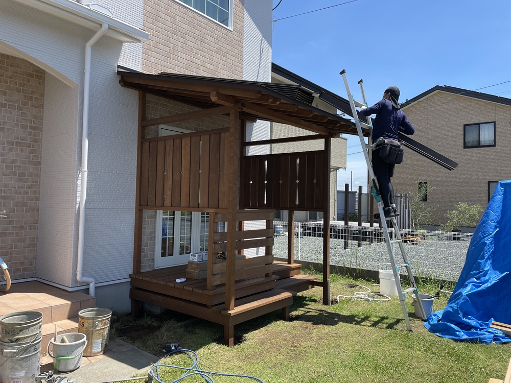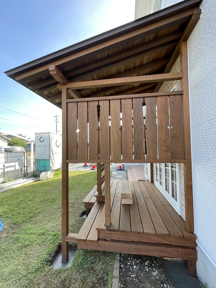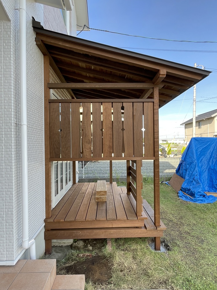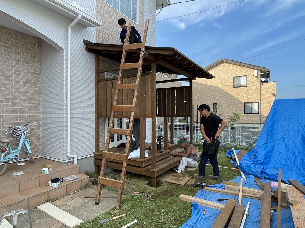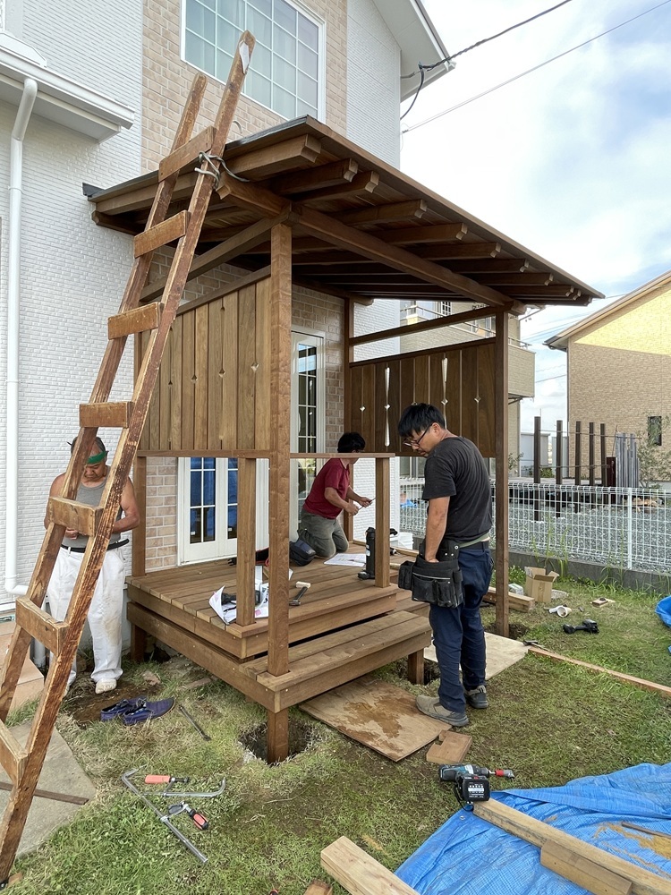 デッキ工事も、大工職方と、板金業者さん、外構業者さんの力添えをもって工事が完成となります。作業が無事終わった時の安堵感ある笑顔は素敵ですね。
