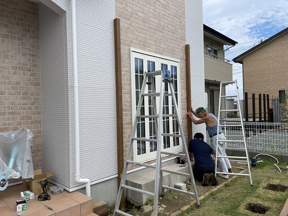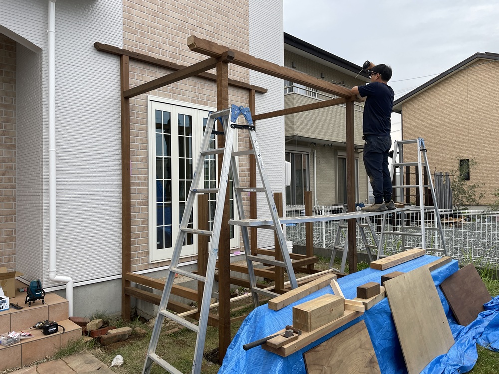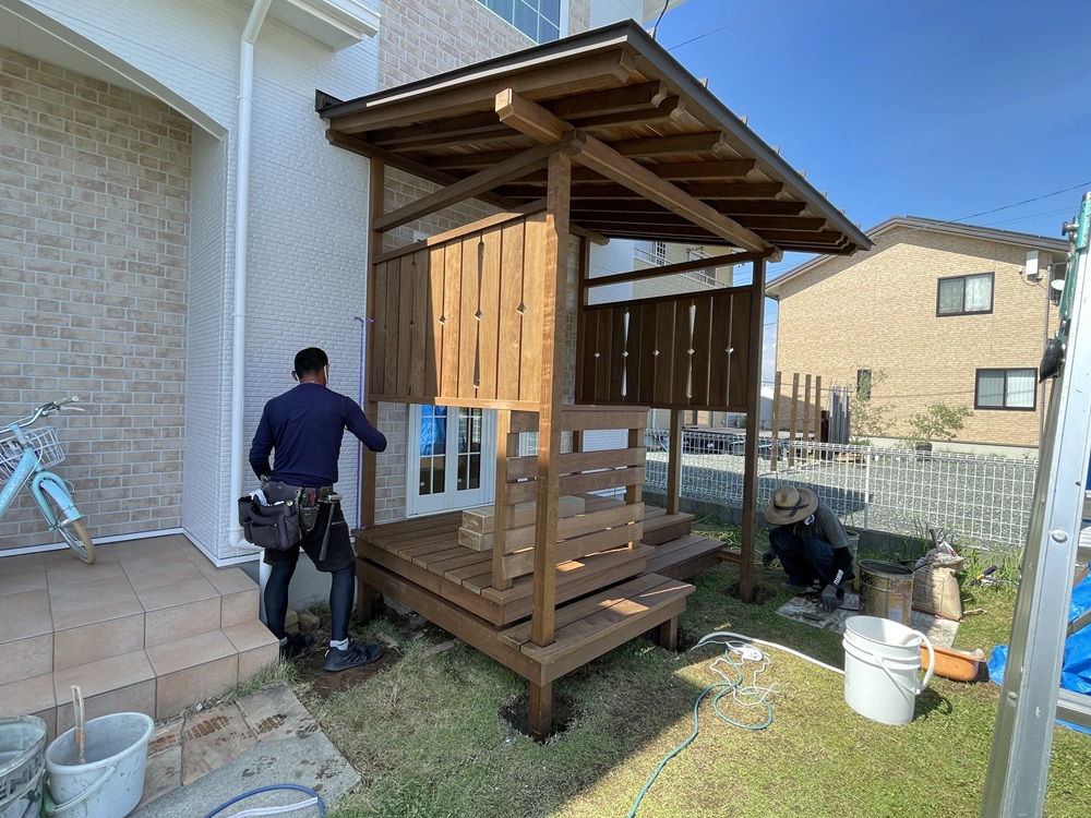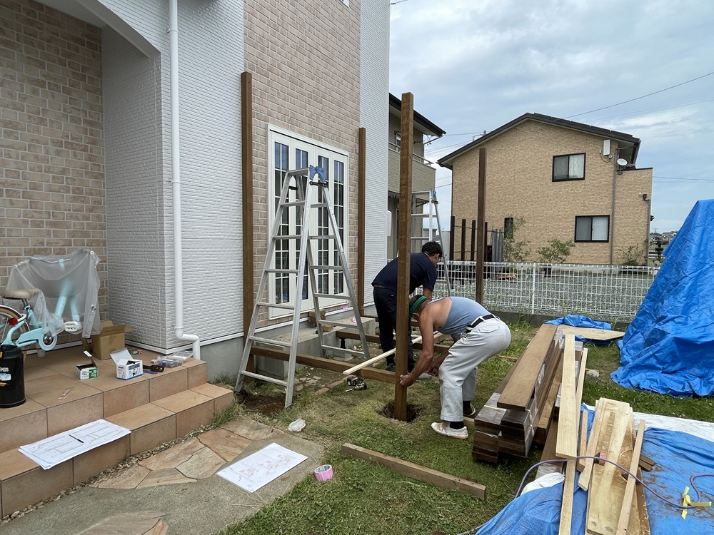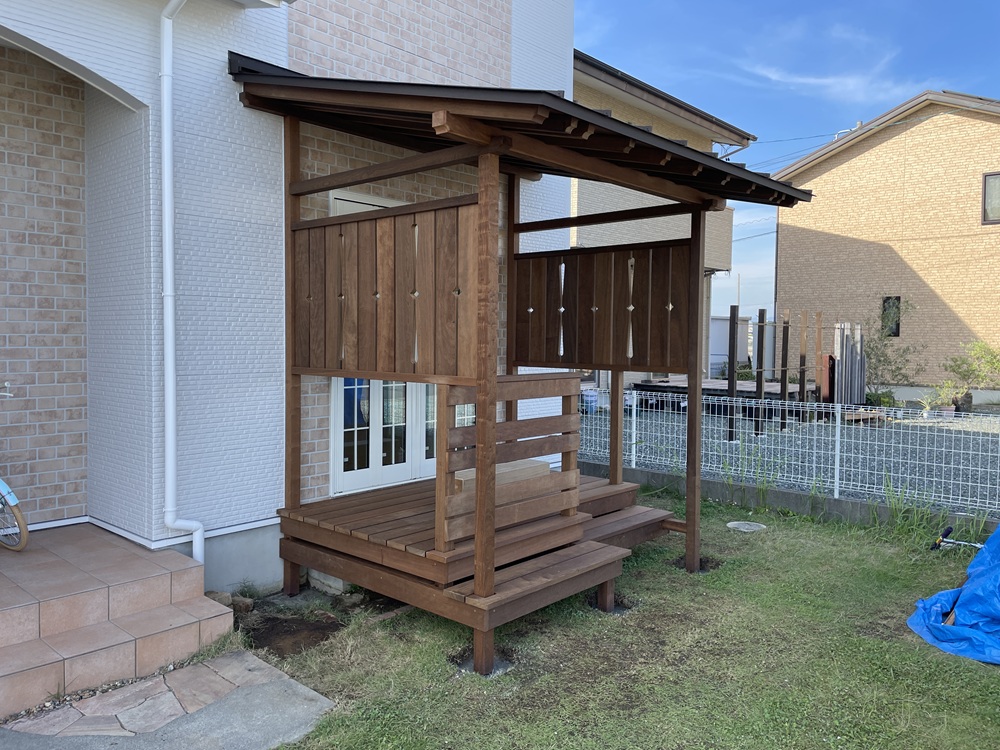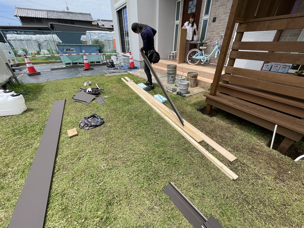 デッキ工事も、大工職方と、板金業者さん、外構業者さんの力添えをもって工事が完成となります。作業が無事終わった時の安堵感ある笑顔は素敵ですね。