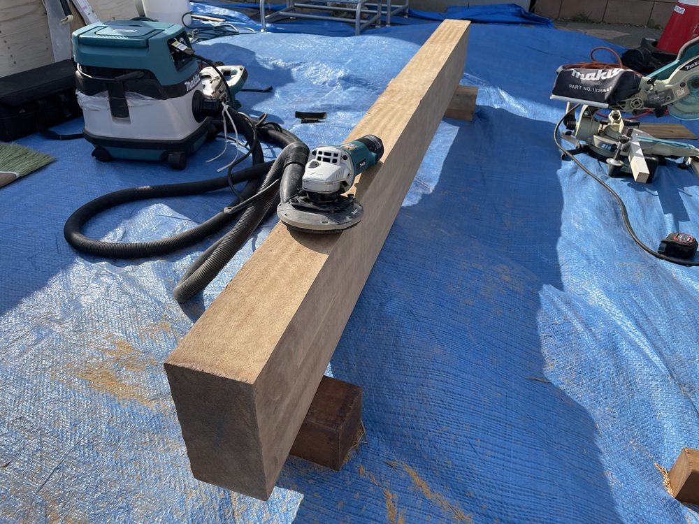 もともとの素材は製材したての状態なので、ホイールサンダーで表面を整えつつも、なんとなく使用感が出るように、雰囲気で意図的にエイジング加工を施してみました。