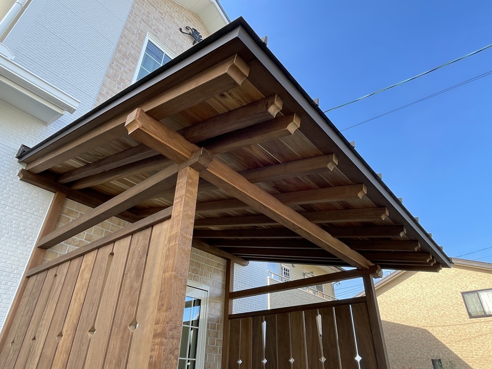 目隠し用の格子板も組み込まれて、だんだん完成形が見えてきました。木工事についてはだいぶ終盤となってきており、最終的に細かなところを整えて木工事が終了となります。全体の調和が整った素敵な形に出来上がってきており、なんとも嬉しい気持ちになります。