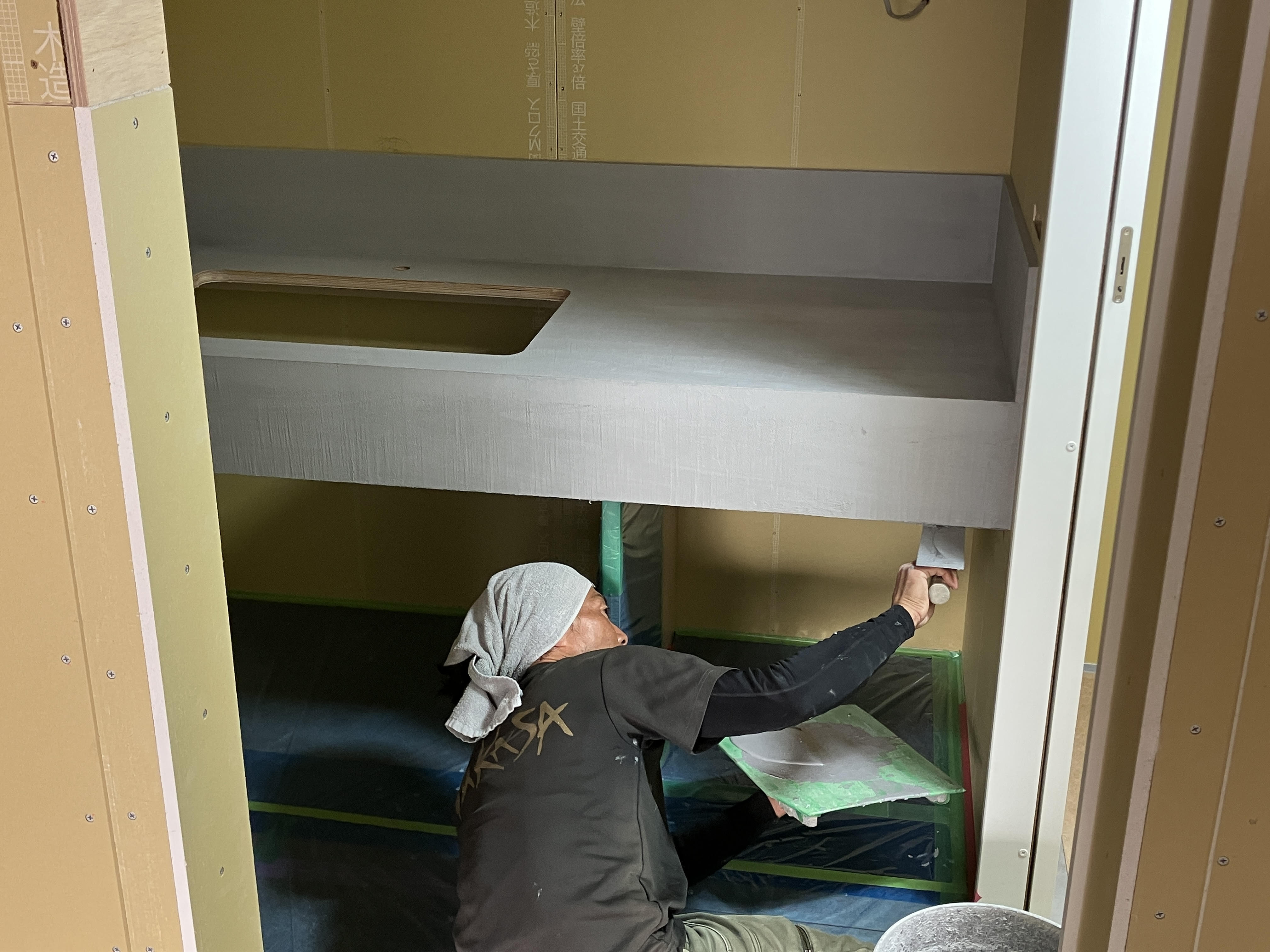 先日現場にて洗面台のモールテックスを施工していただきました。