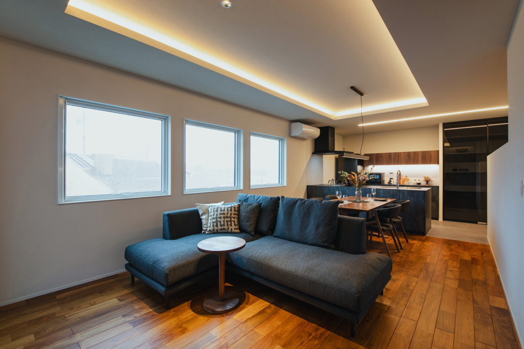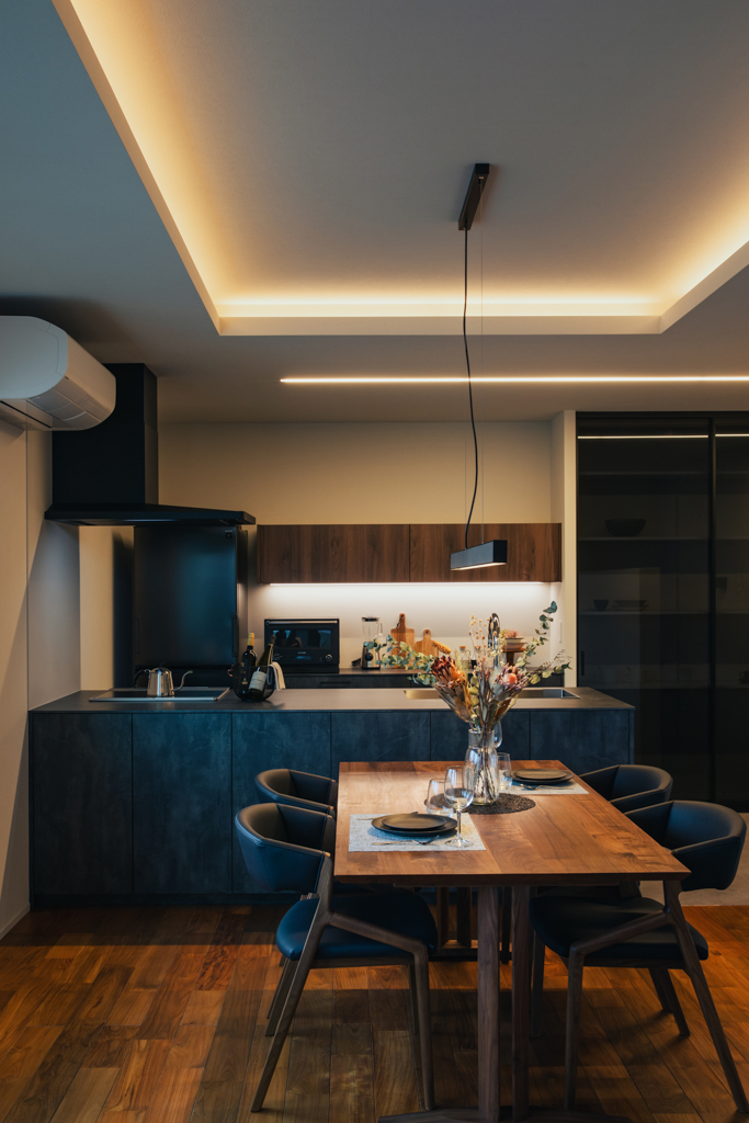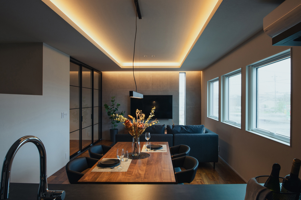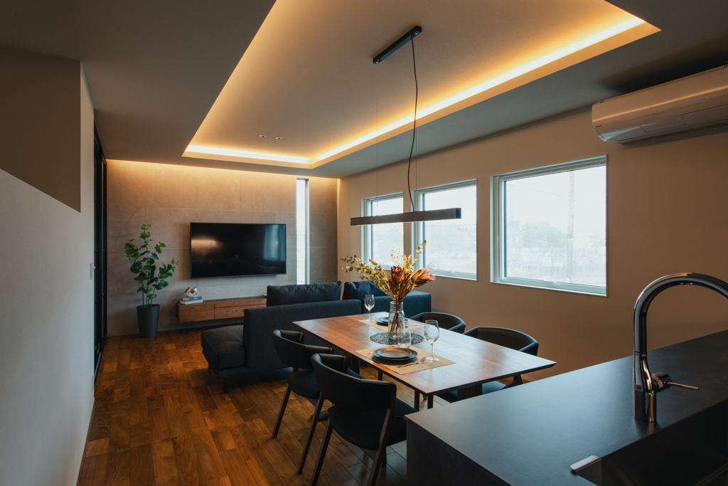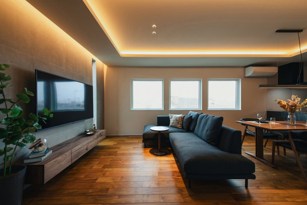 リビング折り上げ天井の間接照明が織りなすホテルライクな重厚感が、