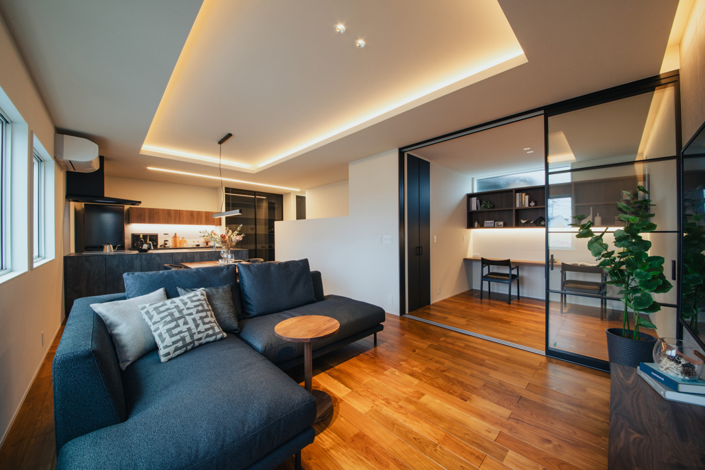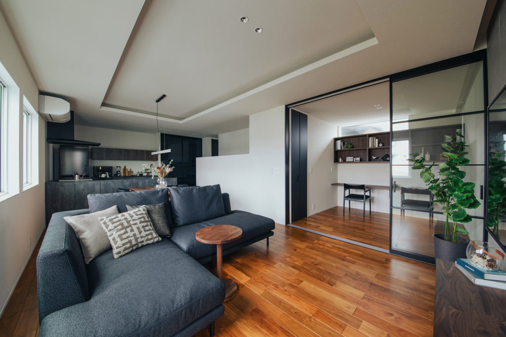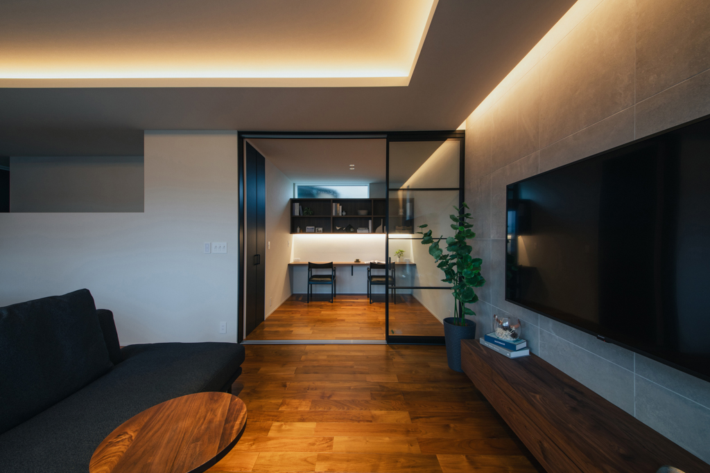 リビングに隣接した書斎は、クリアな格子の建具を採用し