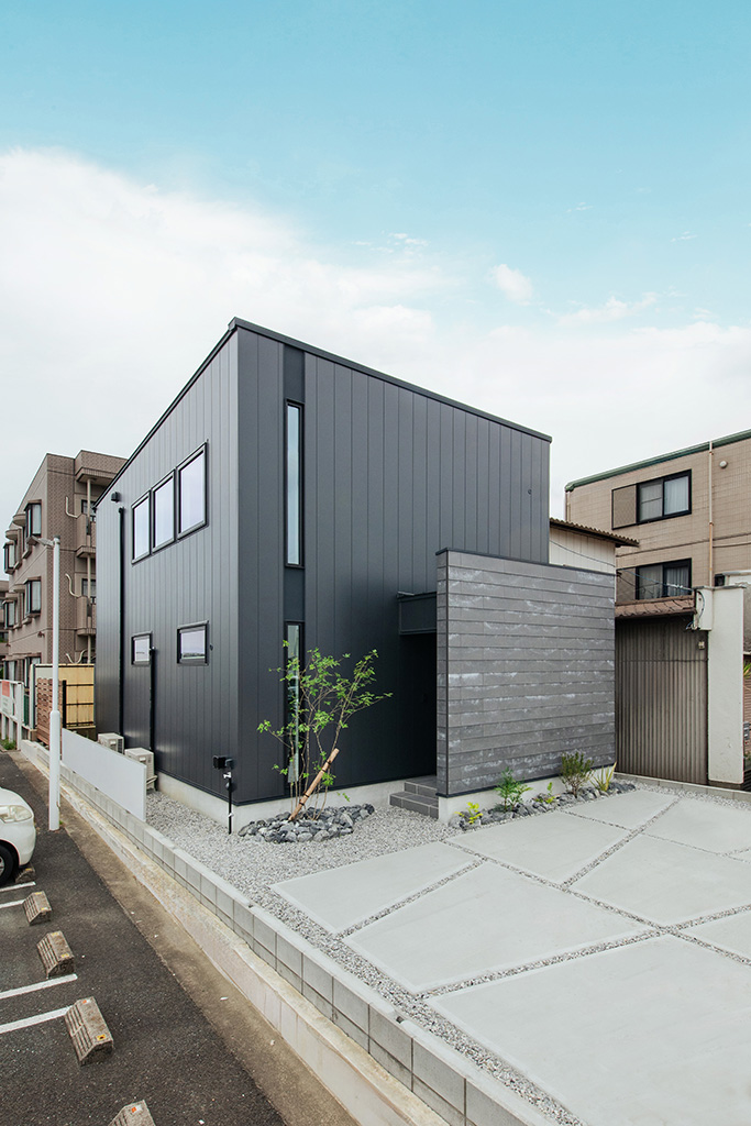 外壁は、光沢感が美しく都会的な印象を与えるクールブラックの金属サイディングに
