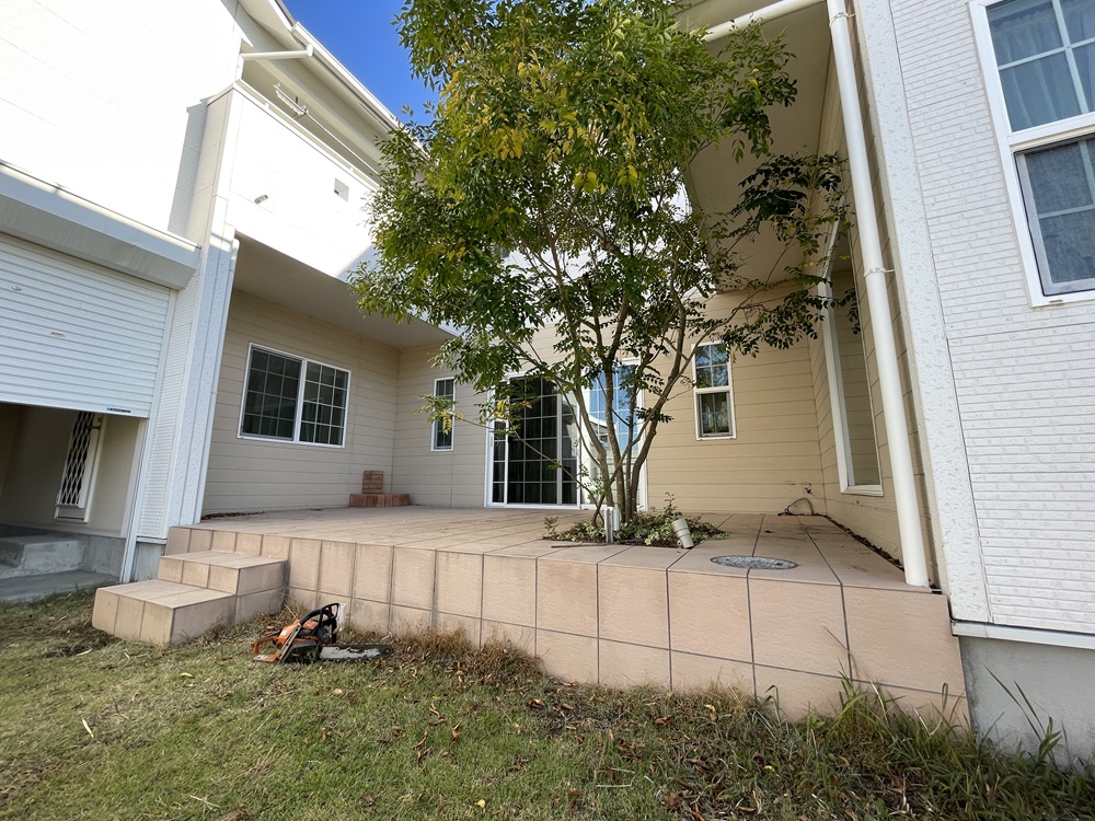 ご家族での楽しい記憶が残る素敵なタイルデッキ、またその中にある長い歳月で育ったシマトネリコの木に対しても色々な思い出や想いを重ねるところがありますが、リフォーム工事の進捗に沿って解体や伐採ならびに抜根に着手する時がやがて訪れてしまいます。