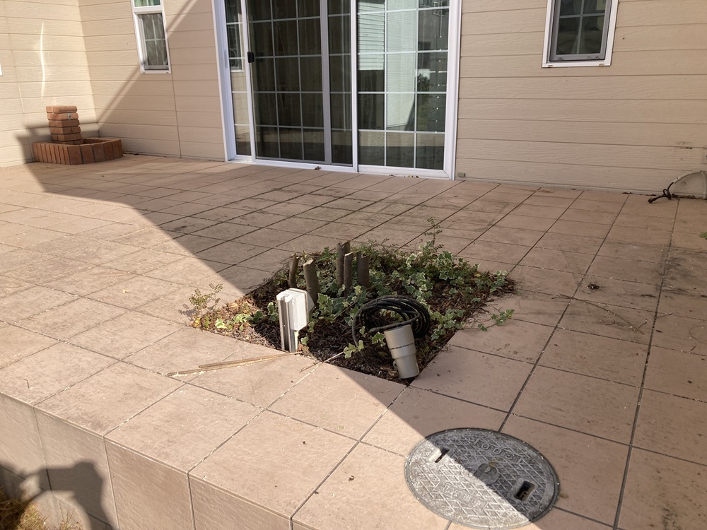この状態での抜根作業は困難な為、ここから先はタイルデッキの解体も進めながら重機を用いて抜根作業に取り掛かるようになります。
