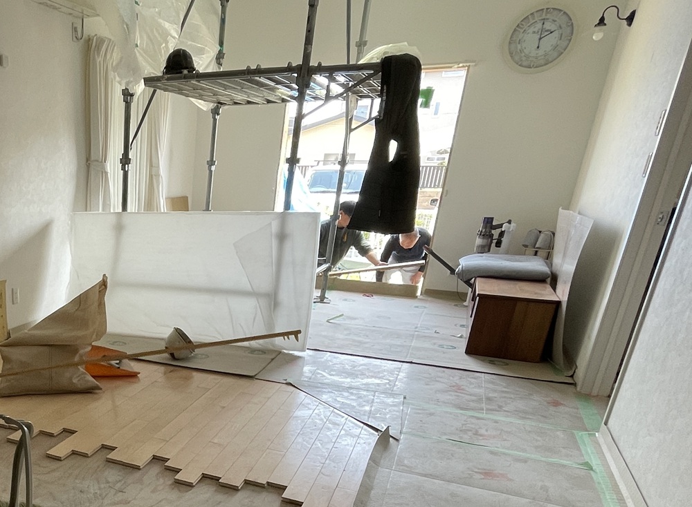 すぐ隣の部屋ではリフォーム工事真っ最中でありながら、解体工事や内部足場組立の進捗に伴い搬出されるタイミングを待っている状態です。
