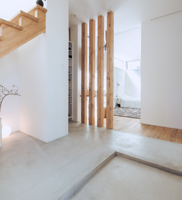 これにより、玄関から室内、あるいは外壁へと続くような、空間全体にシームレスで広々とした統一感が生まれます。
