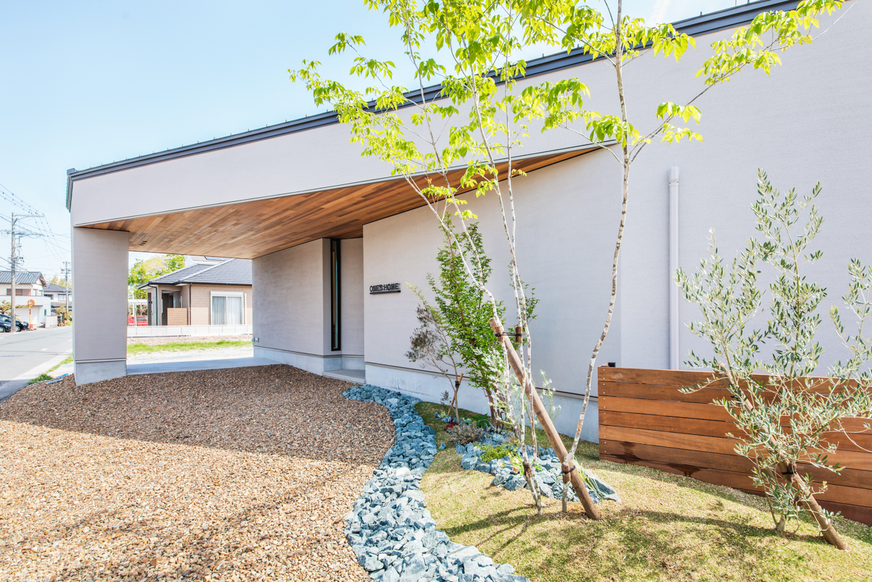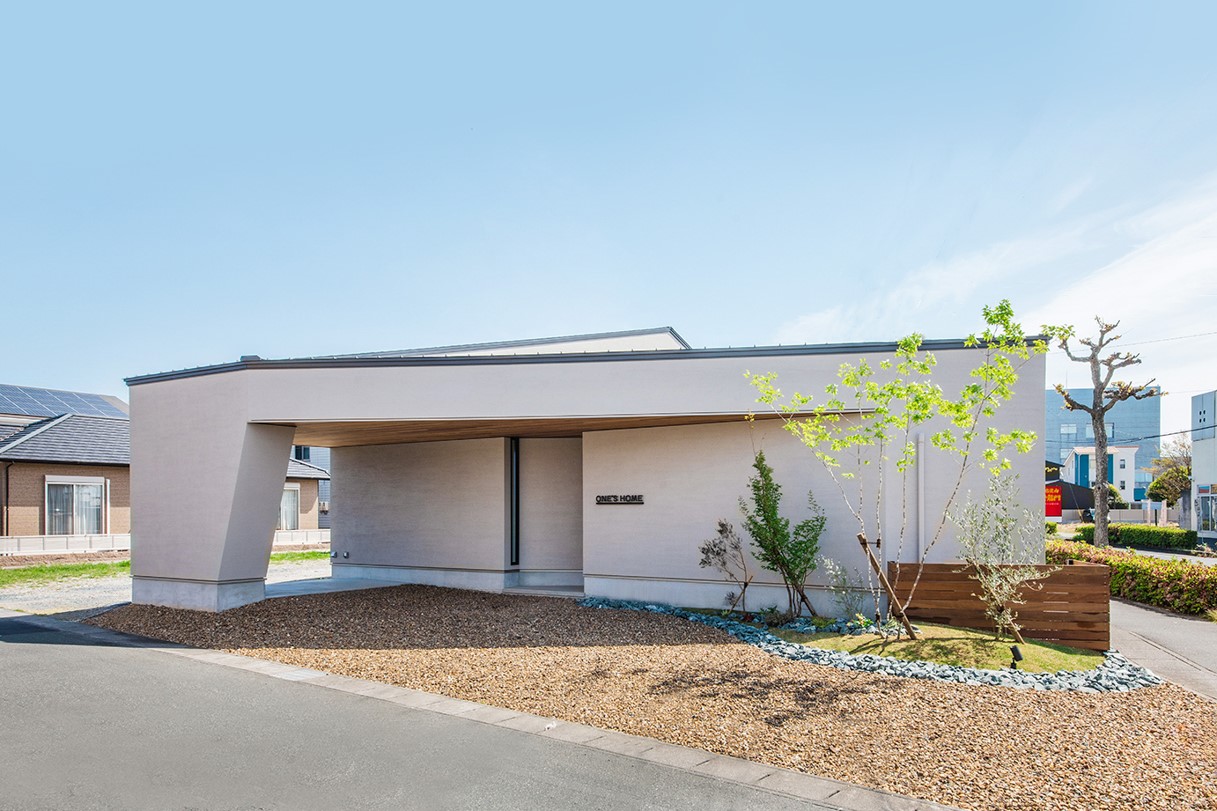 グレイッシュカラーの塗り壁が印象的。植栽も相まって一つの作品のようなデザインに。