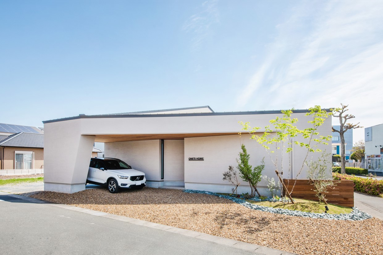 ビルトインガレージのある外観グレイッシュカラーの塗り壁が印象的