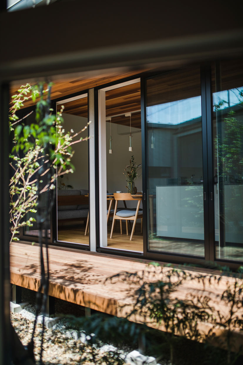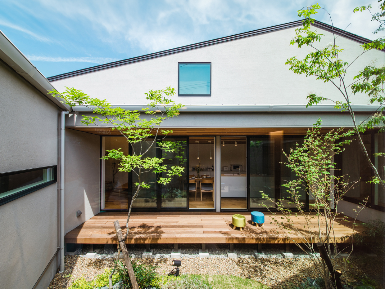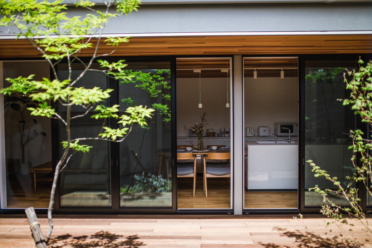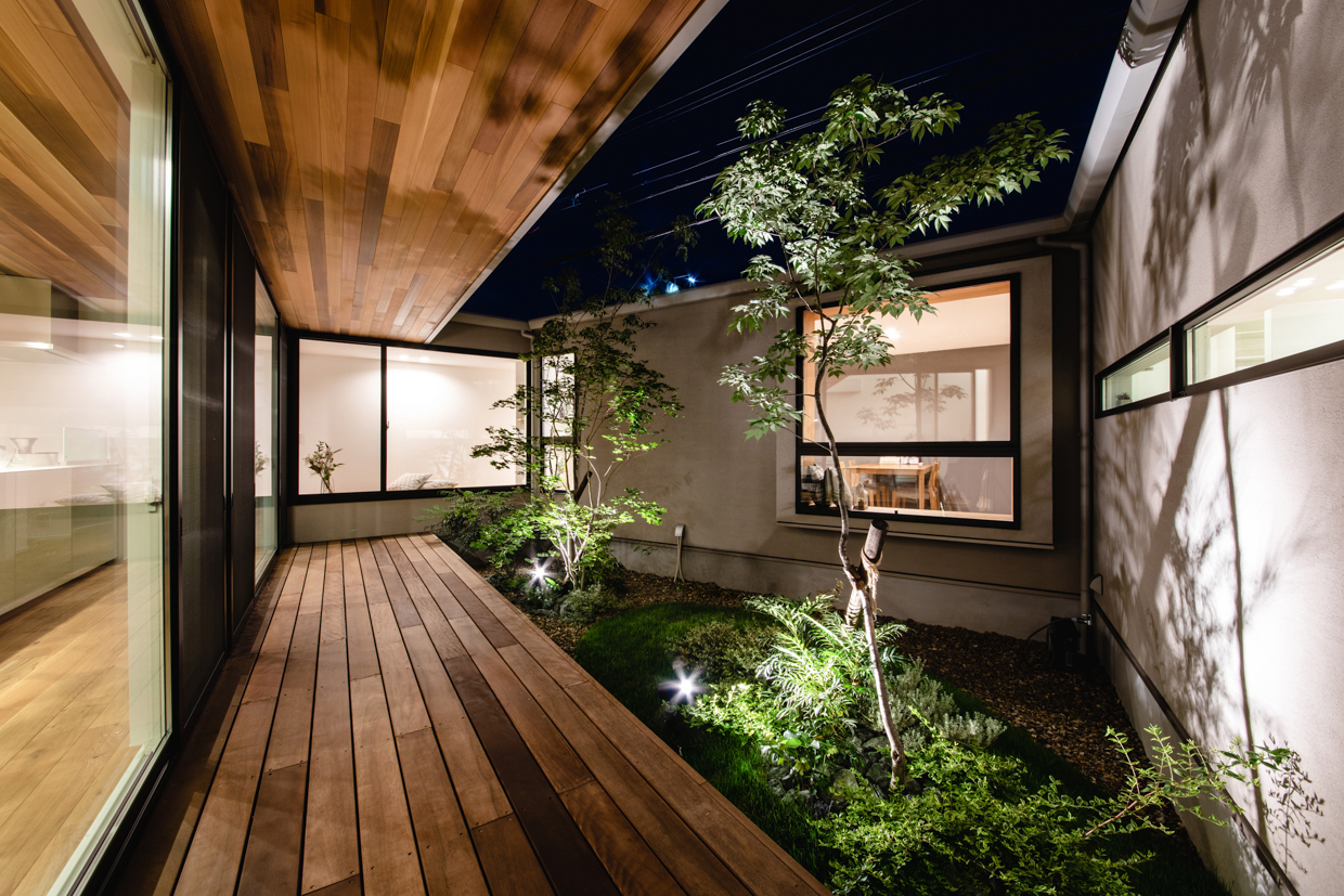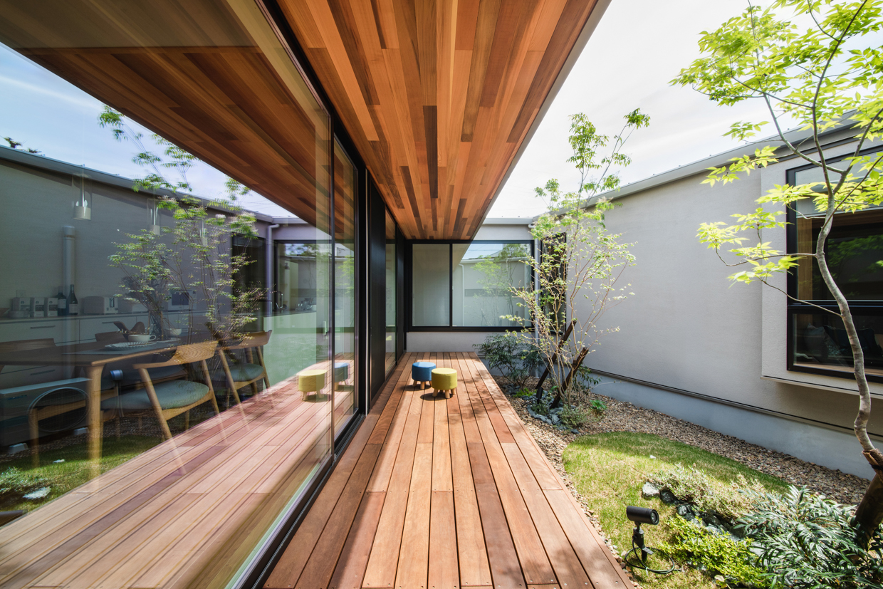 家の外壁に囲われているため外の車通りの喧騒とは離れ、落ち着いて家族だけの時間を過ごせる。