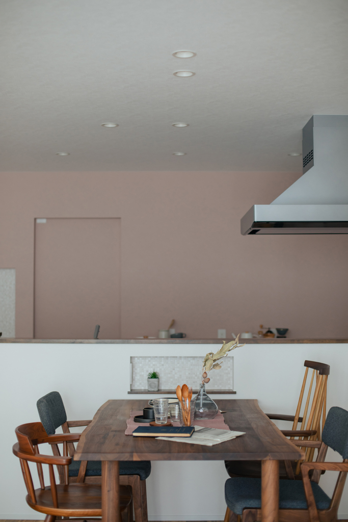 壁は一部漆喰の塗り壁を採用し、塗り壁特有の表面の凹凸で目に入る光がやわらかく、
