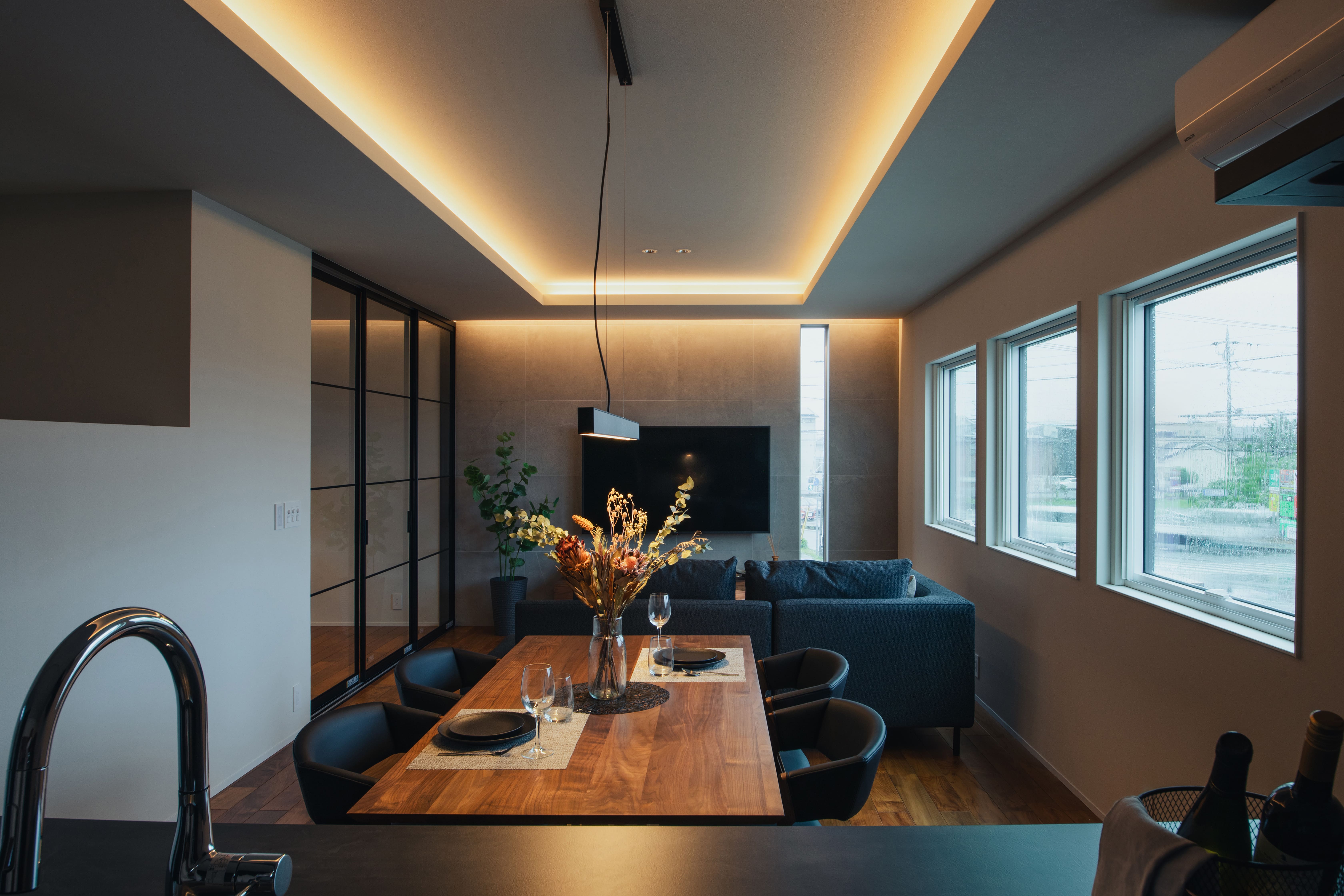 一日の終わりに、目も心も休まる光に。リビングはコーブ照明だけでもきっと十分。