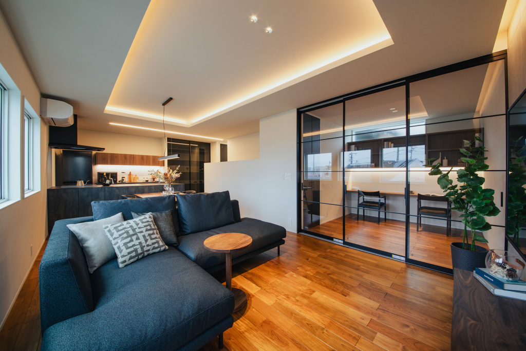 リビングに隣接した書斎は、クリアな格子の建具を採用することで